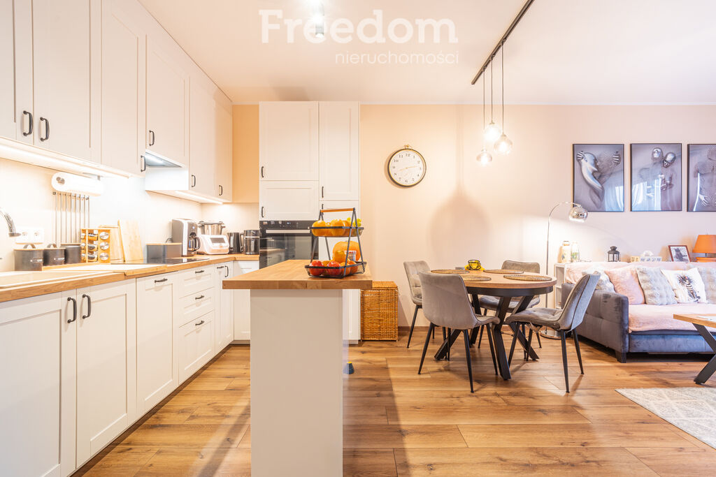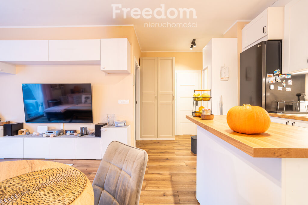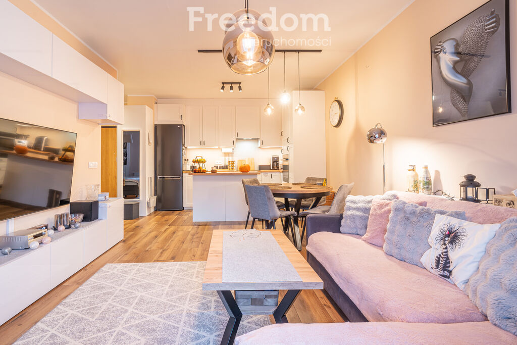 • jasny, przestronny salon z nowoczesnym aneksem kuchennym,